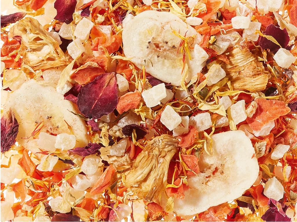Dé d'ananas, morceaux de banane, flocons de carottes, carthame, fleur de souci, arômes, pétales de rose.