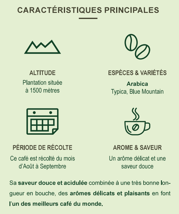 Blue Mountain, célèbre café de Jamaïque. Sa tasse est onctueuse et ravira les fins connaisseurs de café.