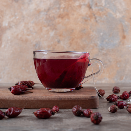Morceaux de pomme, de fraise et de griottes, cranberries, citronnelle, feuille de bambou, stévia, pétales de rose rouge et de bleuet rouge