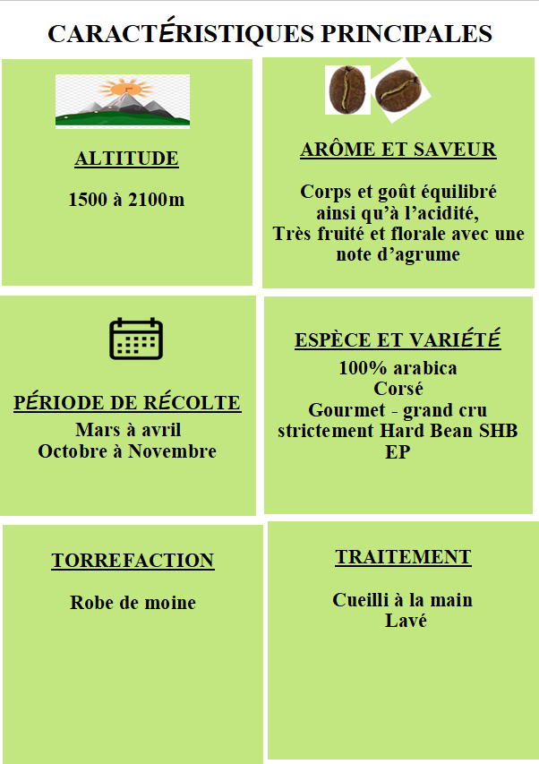 Cultivé dans les hauts plateaux du Kenya, ce café offre une tasse intense et pleine de caractère. Ses arômes riches et puissants révèlent des notes de fruit exotique et florale, avec une légère touche d'agrumes. ce café est parfait pour les amateurs de café en quête d'une expérience gustative unique.